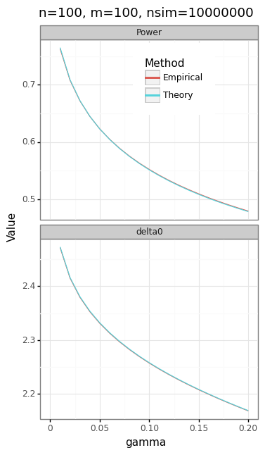 - Higher values of \(m\) (keeping \(n\) and \(\gamma\) fixed) increase statistical power