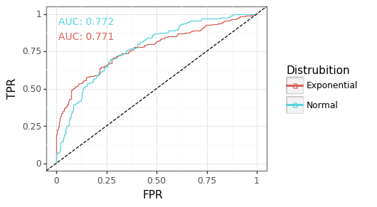 \[\begin{align*} s_i^0 \sim Exp(1)&, \hspace{2mm} s_i^1 \sim Exp(\lambda^{-1}), \hspace{2mm} \lambda \geq 1, \\ P(s_i^1 > s_i^0) &= \frac{\lambda}{1+\lambda}. \end{align*}\]It is easy to see that scale parameter of the normal or exponential distribution can determined a priori to match some pre-specific AUROC target.