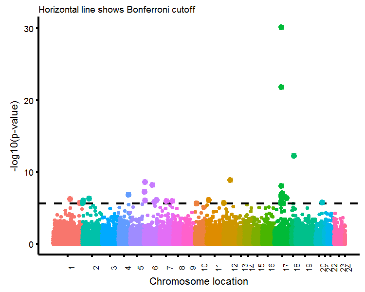 labs(x='Chromosome location',y='-log10(p-value)',subtitle='Horizontal line shows Bonferroni cutoff') +