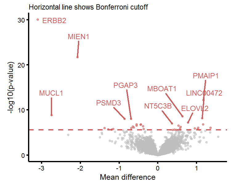 geom_text_repel(data=ttest.bonfer[1:10,],aes(label=symbols),color='indianred',size=4,nudge_y = 5)