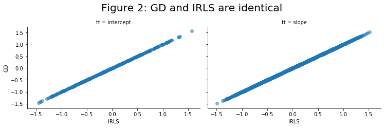 g.fig.suptitle(t='Figure 2: GD and IRLS are identical',fontsize=20)