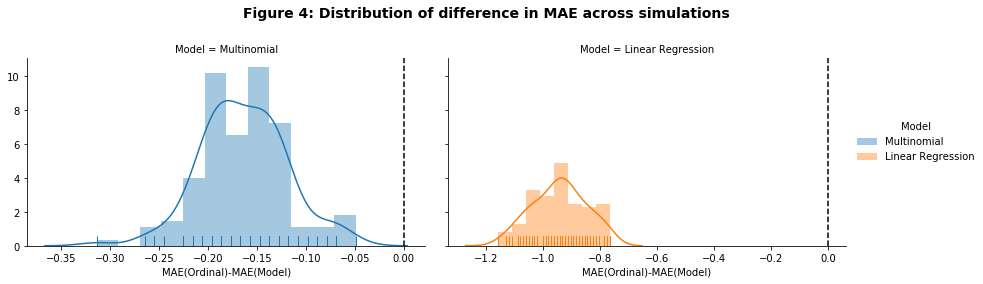 Figure 4 shows that the ordinal regression model outperforms both the multinomial and linear regression model in for every simulation iteration in terms of MAE. This post has shown how to write an optimizer to solve an ordinal regression model using a threshold approach which has \(K-1\) intercepts (or thresholds) that ensure a positively increasing CDF to estimate the underlying ordinal labels. For outcomes where there is a natural and increasing order (like quantiles or ratings) an ordinal approach is well suited. Most importantly, the ordinal loss function encourages predicted labels to be closer to the actual label thereby reducing the likelihood of making large prediction errors (e.g. predicting ‘medium’ instead of ‘high’ when the actual label is ‘low’).