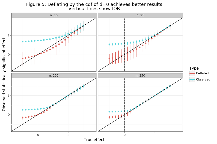 ggtitle('Figure 5: Deflating by the cdf of d=0 achieves better results\nVertical lines show IQR'))